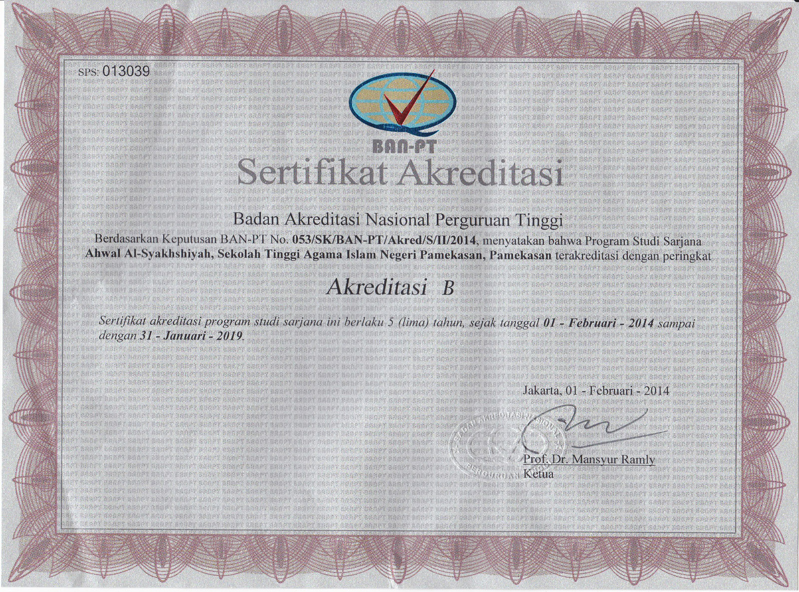 Sertifikat Akreditasi BAN-PT Prodi Ahwal Al-Syakhshiyah
